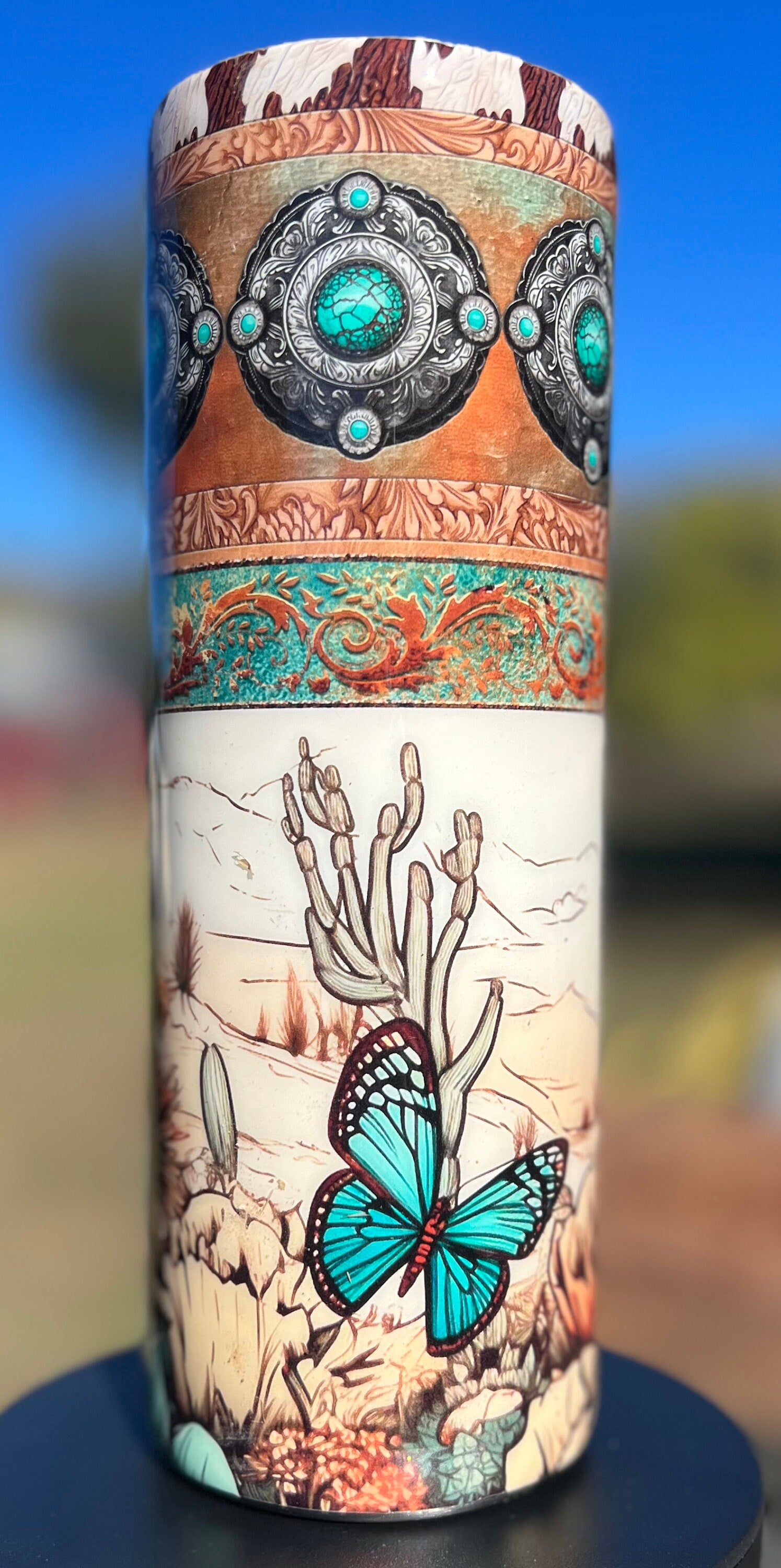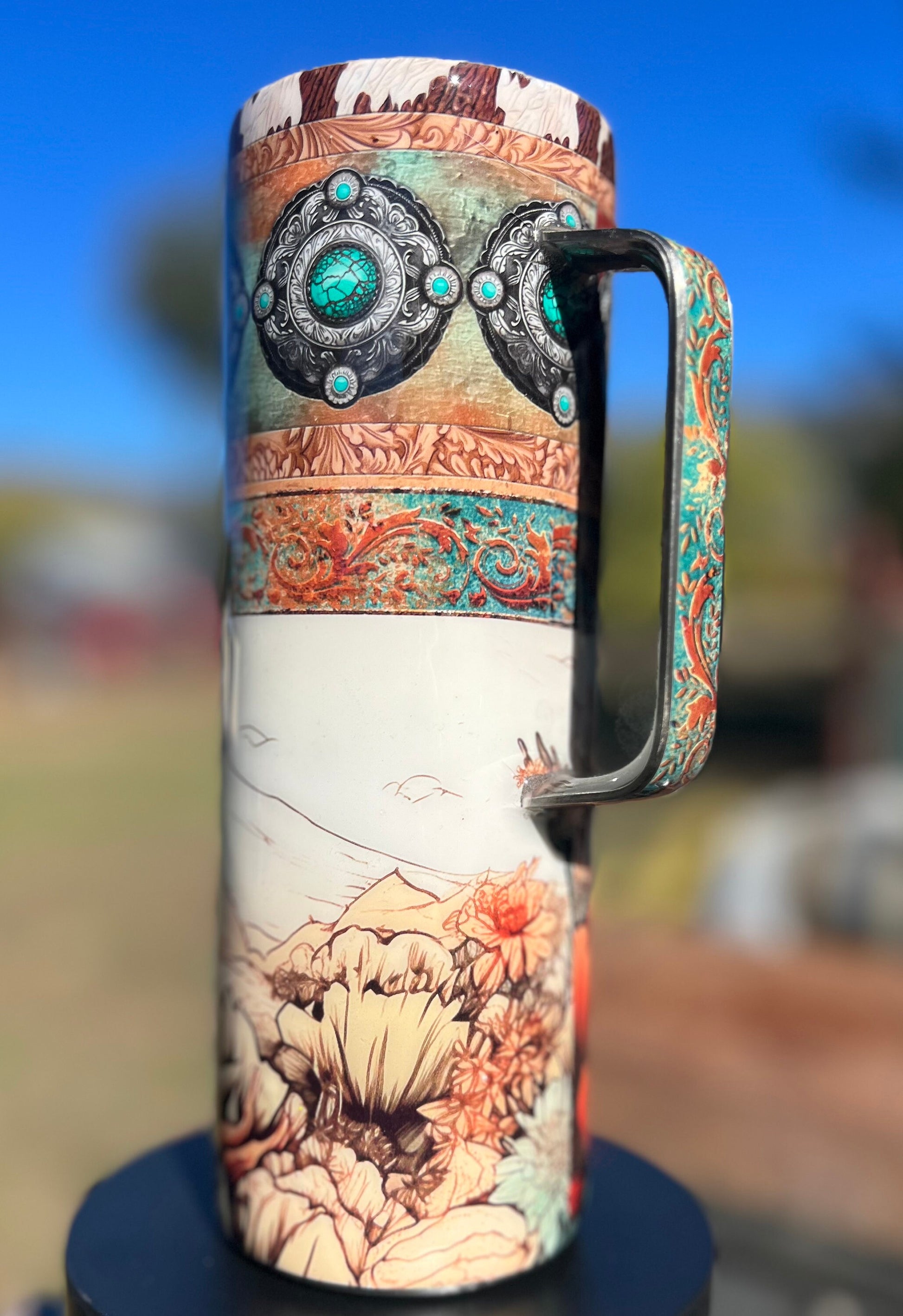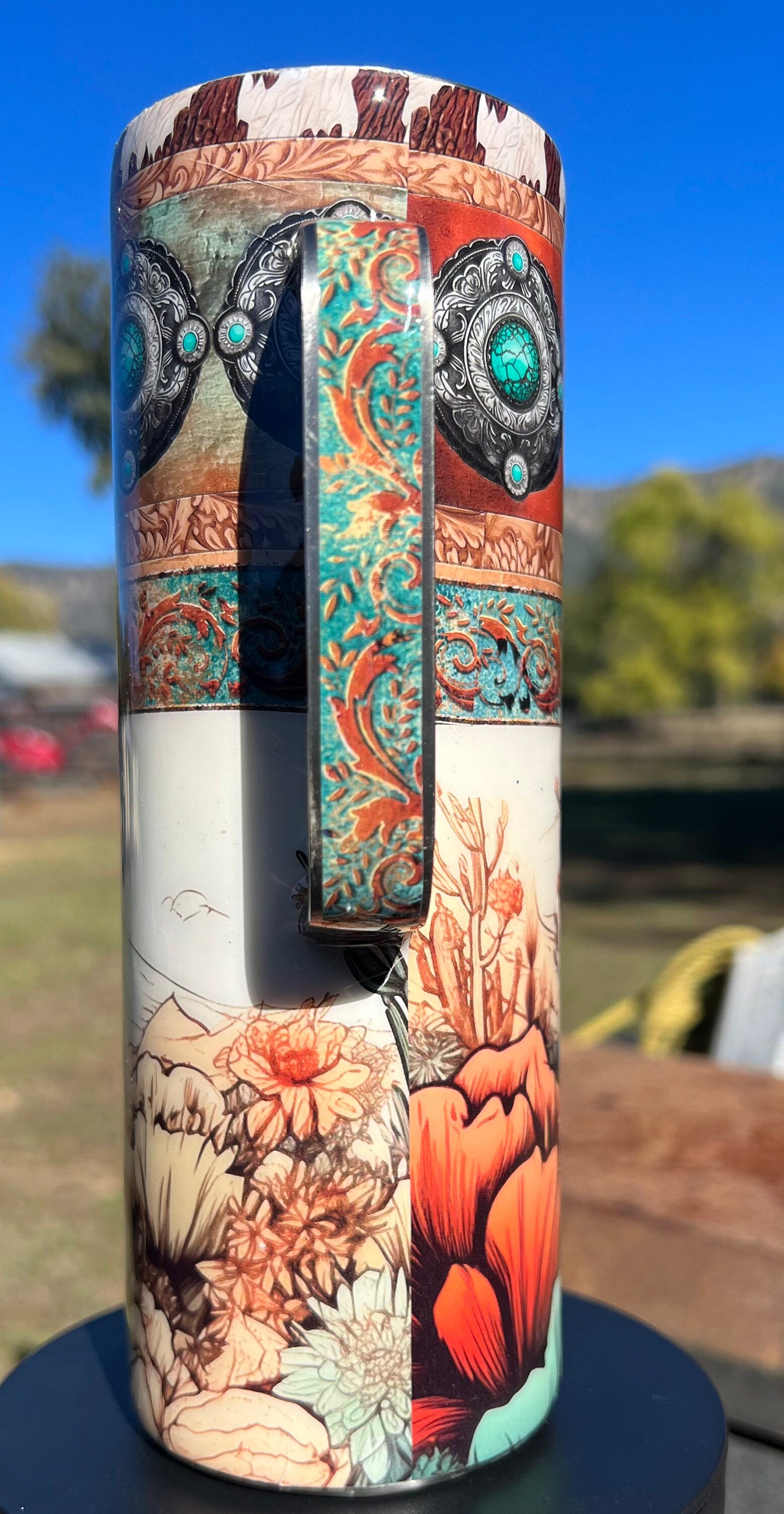 This Western Desert turquoise tumbler will make a perfect gift this holiday season! The color's are vibrant and the handle is finished with the same beautiful turquoise pattern as in the cup. Our premium 20oz tumblers come with a spill proof lid & straw and are amazing at keeping your cold drinks cold and your hot drinks hot.